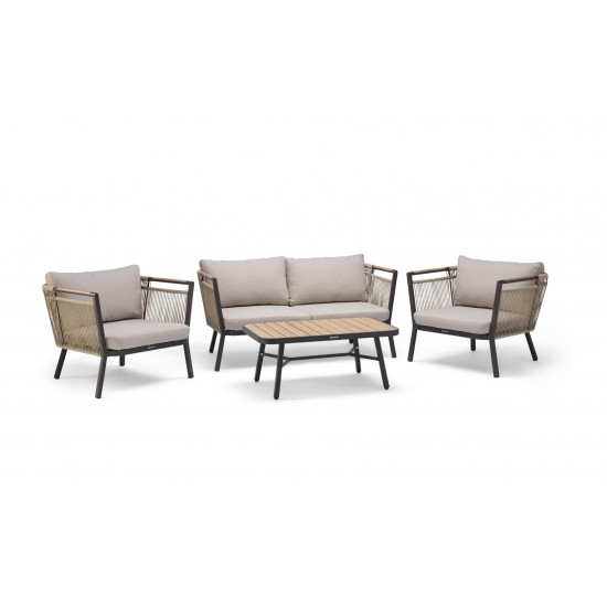 Bali Lounge Set 4-dílný je prémiový zahradní lounge set sestávající z 1 dvoumístné pohovky, 2 lounge křesel a 1 konferenčního stolku. Rozměry: Pohovka – 1800 × 710 × 710 mm, Křeslo – 710 × 860 × 710 mm, Stolek – 600 × 1060 × 420 mm. Záruka: 3 roky. Tento set kombinuje odolnou hliníkovou konstrukci, voděodolné lano a hluboké polštáře pro luxusní pohodlí.
