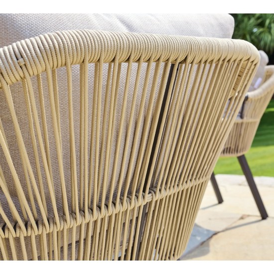Bali Dining Chair je elegantní venkovní jídelní židle navržená pro komfort i odolnost. What’s included: 1× Bali Dining Chair s rámem z antikorozi hliníku, detailem z hydrofobního lana a hlubokými polštáři. Rozměry: š. 650 mm × hl. 630 mm × v. 790 mm; Váha: 4 kg. Záruka: 3 roky. Ideální pro terasu, balkon nebo zahradní jídelnu.