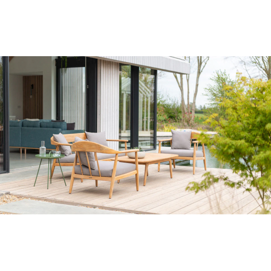 Teakové dřevo s časem získává krásnou stříbřitě-šedou patinu a polštáře z kvalitní tkaniny Agora jsou odolné proti vyblednutí a lehkým dešťům. Obaly na polštáře jsou součástí; doporučeno ukládat polštáře mimo sezónu. 10 let záruky.