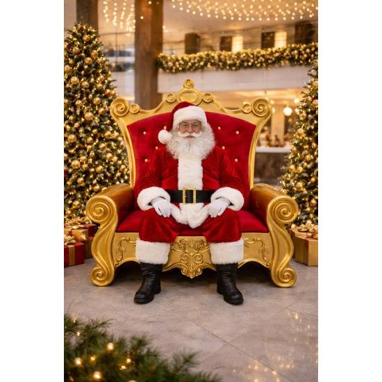 Santa Sofa v červené a zlaté barvě je elegantní vánoční trůn v životní velikosti, který spojuje luxusní vzhled s pohodlným sezením. Bohaté sváteční barvy připomínají teplo a radost vánoční sezóny a přitahují pozornost návštěvníků.