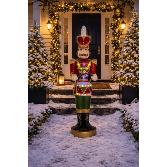 Animovaný bubnující voják s LED osvětlením o výšce 159 cm je výrazná vánoční dekorace vhodná pro obchodní centra, hotely, restaurace i veřejné prostory. Postava vojáka v tradiční uniformě rytmicky bubnuje a vytváří slavnostní atmosféru, která přitahuje pozornost návštěvníků. Odolná konstrukce z laminátové pryskyřice umožňuje použití jak v interiéru, tak i venku.