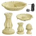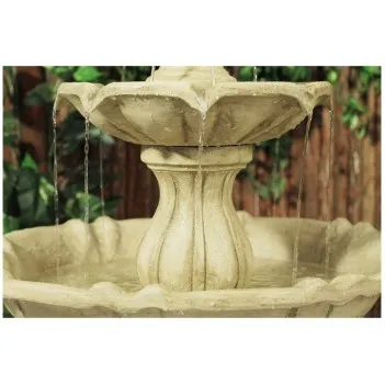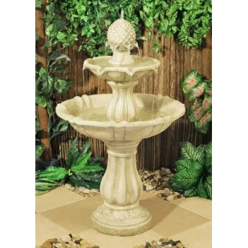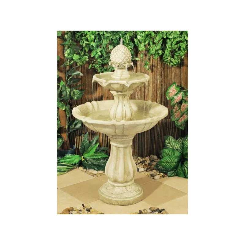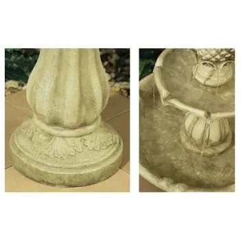 Tato atraktivní vícepatrová fontána se může stát ústředním, úžasně vzbuzujícím ústředním bodem v každé zahradě. Vyrobeno z Polyresinu, zatímco starožitné povrchy připomínají slonovinu. Voda vytéká z ananasu nahoru a jemně stéká dolů do misky a vytváří klidný proud vody.