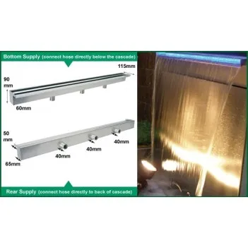Trubky vyčnívající ze zadní nebo spodní části kaskády mají přibližně 1,1 palce (3 cm) vnitřní závit. Dodáváme závitový 25mm nástavec pro snadné připojení kaskádového výstupu na 25mm hadici. Vezměte prosím na vědomí, že pro větší šířky 90 cm a více je vzadu více než jedna trubka - takže pro připojení jednoho čerpadla ke kaskádě budete muset použít rozdělovač hadic (2-out nebo 3-out).