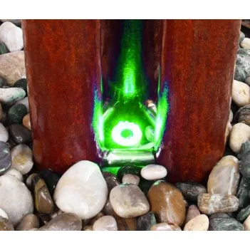 Tato nádherná fontána je vyrobena z Corten oceli, která jí dodává velkolepý, jedinečný vzhled. Když perlivá voda z horní části dekorace padá, cortenová ocel s ní reaguje a vytváří rezavý povrch, oxiduje povrch, aby byl vodotěsný a odolný proti korozi a také výjimečně estetický. Zvětralá ocel se rychle stává surovinou moderní architektury, chválená pro svůj jedinečný, moderní styl. Tento proces můžete urychlit potíráním povrchu solí a/nebo octem. Tato dekorace zůstává krásná i v noci, kdy se mění barva vestavěných LED světel, osvětlujících jemně padající vodu i samotnou fontánu.