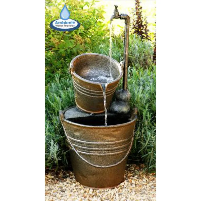 Tento krásně vytvořený vodní prvek se dvěma kbelíky a kohoutkem byl skvěle navržen tak, aby vypadal téměř přesně jako skutečné mosazné kbelíky pod kohoutkem. Užijte si relaxaci se zvuky jemně tryskající vody díky této funkci, která dodává skutečný pocit klidu jakémukoli prostředí, ve kterém je umístěn. Tento autentický a venkovsky vypadající vodní prvek je fantastickým doplňkem vaší zahrady nebo domova.