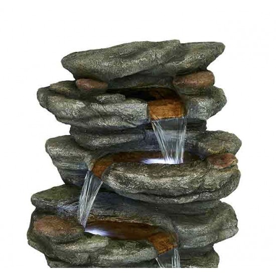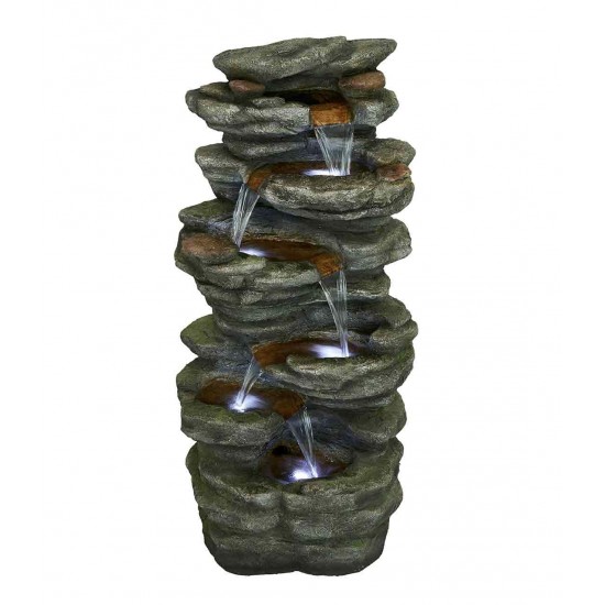 Tampa Slate Falls je stylová zahradní fontána inspirovaná přírodním břidlicovým kamenem. Šestistupňová konstrukce umožňuje plynulý tok vody mezi jednotlivými úrovněmi, čímž vytváří uklidňující atmosféru. Vyrobena je z odolné pryskyřice vhodné pro venkovní použití. LED osvětlení zvýrazňuje efekt vody i v noci a napájení ze sítě zajišťuje stabilní provoz. Rozměry: L 46 x W 31 x H 101 cm.