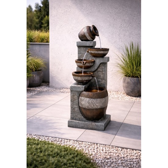 Model Brentwood Pouring Pots spojuje klasický vzhled s moderní funkčností. Konstrukce napodobuje přelévající se nádoby, které vytvářejí přirozený kaskádový efekt vody. Vysoce kvalitní pryskyřice zajišťuje odolnost vůči povětrnostním vlivům. LED osvětlení podtrhuje pohyb vody a vytváří příjemnou atmosféru večer.