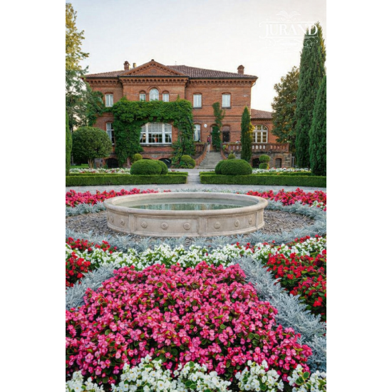 Dekorativní jezírko inspirované klasickou zahradní architekturou kombinuje jednoduchý kruhový tvar s jemnými květinovými ornamenty. Tyto detaily dodávají nádrži elegantní a harmonický vzhled.