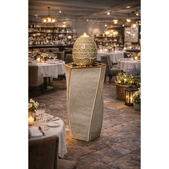 Keramická vodní fontána Olvera ve tvaru ananasu má rozměry 86 cm na výšku a 32,5 × 32,5 cm na šířku a hloubku, což z ní činí výrazný prvek pro zahradu nebo terasu. Je vyrobena z odolného poliresinu se šedou keramickou úpravou, obsahuje čerpadlo 7 W, nádrž i LED osvětlení. Napájení ze sítě umožňuje nepřetržitý provoz a dekorativní efekt proudící vody.