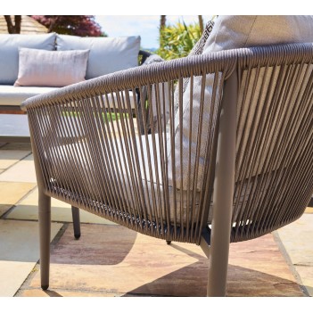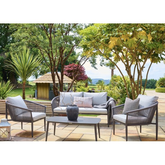 Sama Kyoto Lounge Set spojuje moderní design s odolností pro venkovní použití. Pevný hliníkový rám odolává korozi, což zajišťuje dlouhou životnost i při expozici nepříznivému počasí. Jemné lano dodává texturu a vizuální lehkost, zatímco světle šedé polyesterové polstry poskytují komfortní posezení. Konferenční stolek s keramicky potištěným sklem je stylový a snadno se čistí, ideální pro venkovní použití. Tento set zahrnuje dvoumístnou pohovku, dvě lounge křesla a konferenční stolek, čímž vytváří elegantní a pohodlnou relaxační zónu pro terasy, balkony nebo zahrady. Díky použití kvalitních materiálů je sada nenáročná na údržbu a dlouhodobě odolná. 3-letá záruka podtrhuje vysokou kvalitu a spolehlivost tohoto produktu.