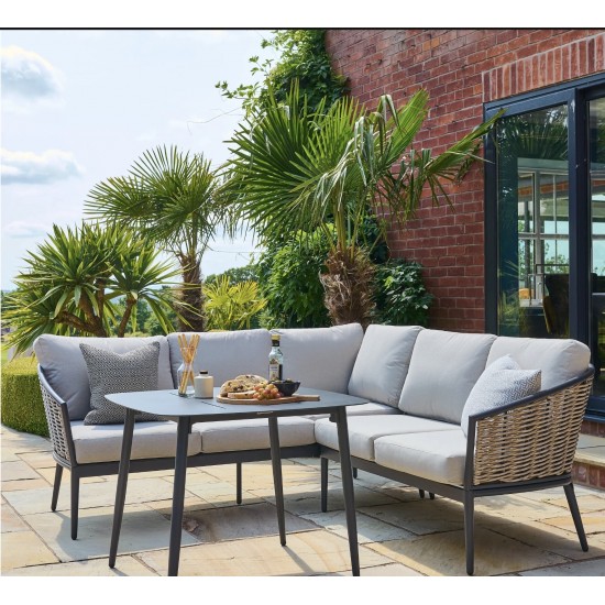 Pavilion Square Casual Dining Set je elegantní venkovní sada zahradního nábytku ideální pro neformální stolování a odpočinek. What’s included: 1 rohová sedačka Pavilion Casual (1960 × 760 × 730 mm) a 1 čtvercový jídelní stůl Pavilion (850 × 670 × 850 mm), vyrobené z hliníku a ručně pleteného ratanového materiálu s polštáři z polyesteru. Záruka: 3 roky na rám a pletení, 2 roky na polštáře.