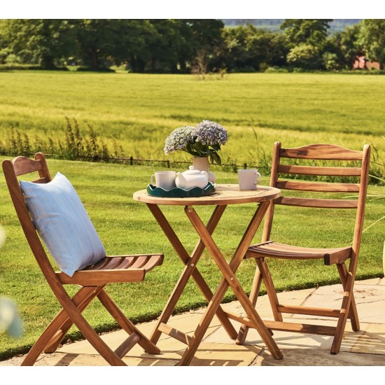 Redcliffe Acacia Wood Tea for Two Set je stylová venkovní sada z masivního akáciového dřeva vhodná pro ranní kávu či odpolední čaj. What’s included: 2 skládací židle a 1 skládací stůl. Rozměry stolku: 650 × 650 × 730 mm, židle: 470 × 600 × 910 mm. Záruka: 3 roky.