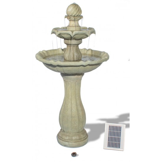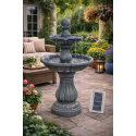 Antique Solar Imperial Round Tiered Water Fountain s LED osvětlením je elegantní třípatrová zahradní fontána s povrchovou úpravou imitující pískovec. Vyrobena z odolného polyresinu pro venkovní použití. Rozměry: výška 110 cm, šířka 52 cm, hloubka 52 cm. Solární napájení, integrovaná nádrž a čerpadlo (250 LPH) jsou součástí. Bílé LED osvětlení zvýrazňuje proudící vodu i po setmění.