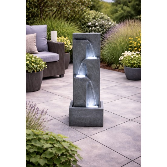 Konstrukce z kvalitní pryskyřice zajišťuje dlouhou životnost i při venkovním použití. Efekt tekoucí vody mezi sloupci vytváří uklidňující atmosféru, ideální pro relaxaci.