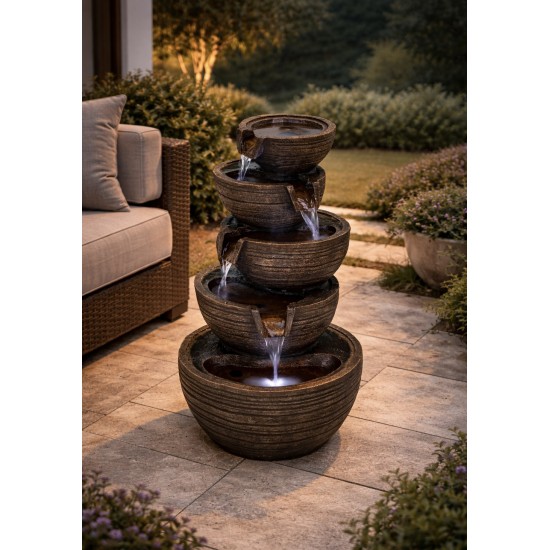 Solar Brown Bowls je dekorativní solární zahradní fontána s moderním designem kaskádových misek. Voda jemně přetéká mezi jednotlivými miskami a vytváří uklidňující efekt proudící vody. Fontána je vyrobena z odolné pryskyřice vhodné pro venkovní použití. Integrované LED osvětlení zvýrazňuje vodní efekt po setmění. Díky solárnímu napájení není nutné elektrické připojení, což z ní činí praktický a ekologický doplněk pro zahradu, terasu nebo patio.