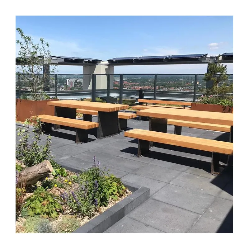 Stůl z oceli Corten s lavičkami na zahradu nebo pro použití ve veřejných prostorách: např