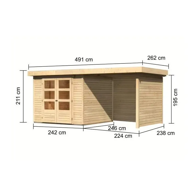 Zahradní domek Askola 5 šedý, šířka 2,40 m, prodloužená střecha, zadní stěna a boční stěna