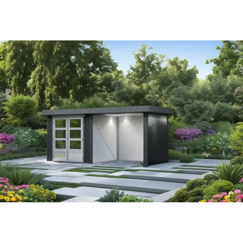 Zahradní domek Askola 5 šedý, šířka 2,80 m, prodloužená střecha, zadní stěna a boční stěna