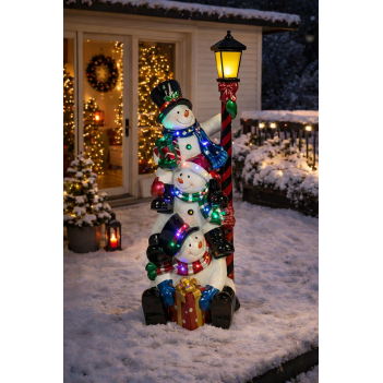 Tato vánoční dekorace přináší do prostoru příjemnou zimní atmosféru. Postava tří sněhuláků v zimním oblečení je doplněna dekorativní lampou se slavnostní mašlí. Vestavěné LED osvětlení (25 diod) vytváří měkké světlo, které zvýrazňuje detaily celé scény.