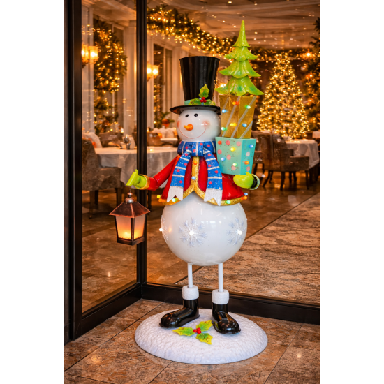 Snowman with Tree & Lamp je součástí kolekce dekorací se sněhuláky, které jsou vyráběny z odolných materiálů vhodných pro profesionální vánoční instalace.