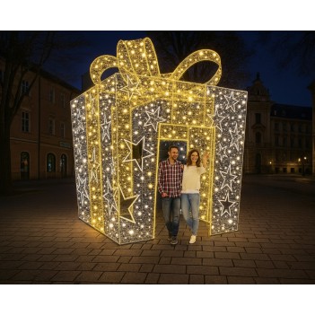 3D dárková krabice s osvětlením má rozměry 320 x 320 x 400 cm a váží 161 kg. Je určena pro vnitřní i venkovní instalaci a díky odolné konstrukci a integrovanému LED osvětlení nabízí poutavý vizuální zážitek. Uvnitř je možné projít. Ideální pro nákupní centra a veřejné prostory.
