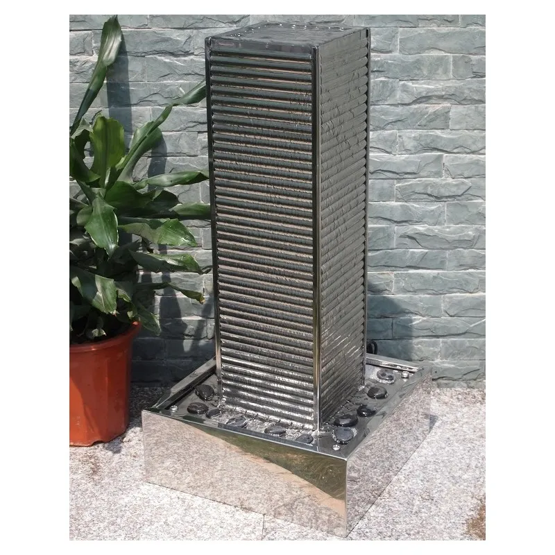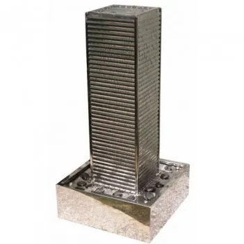 Vodní efekt v moderním stylu z nerezové oceli je skvělou ozdobou každé zahrady nebo terasy. Plně samostatně stojící fontána s vodní kaskádou shora se zvlněnou stěnou naplňující zahradu uklidňující atmosférou a skvělým zvukem. Podsvícený LED diodami vypadá úžasně jak v noci, tak ve dne.