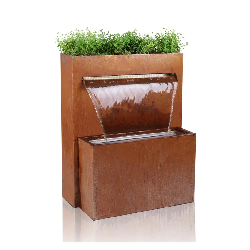 Tato vodní dekorace zpočátku vypadá jako jakákoli jiná ocelová fontána. Po pár dnech používání však vytvoří velmi podobný povrch sloužící jako ochranná vrstva. Chrání před další korozí a navíc je zcela unikátní. Spolu s nasazeným čerpadlem je možné jej okamžitě spustit. Je plně soběstačný, takže vše, co musíte udělat, je přidat vodu. Fontána je zakončena vestavěnými LED světly, která dekoraci v noci oživí a krásně osvětlí zrcadlo vody padající z čepele. Doplňte vzhled zasazením květin do horního květináče.