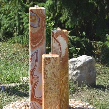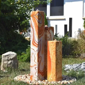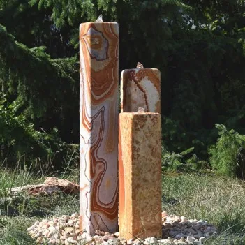 sloupy kašny z masivního barevného duhového pískovce jsou silné 15x15 cm a vysoké 60, 90 a 120 cm. Tlak vody lze regulovat pomocí 3cestného vodního ventilu, který je součástí dodávky, takže lze pohodlně nastavit množství vody na každém sloupku. Prostorná nádrž na vodu má kapacitu 180 litrů a ušetří vám starosti s doplňováním, zejména v horkých dnech. Obdržíte kompletní fontánu se základním vybavením pro vlastní montáž. Široká nabídka příslušenství vám otevírá nové možnosti. Například lze osvětlit vývody vody nebo přímo fontánu osvětlit LED body. Zapnout a vypnout stisknutím tlačítka? Se zahradní zásuvkou InScenio System je to možné na vzdálenost až 80 m. Jednotlivé plochy kolem fontány vyzdobte ozdobnými kameny, podle nálady. Tato exkluzivní sada zahradních fontán nesplní žádné přání.