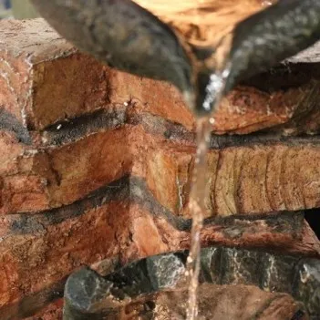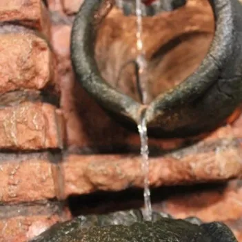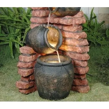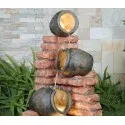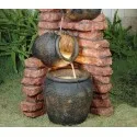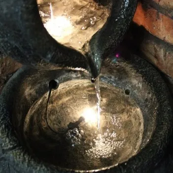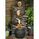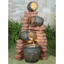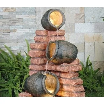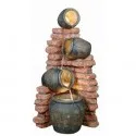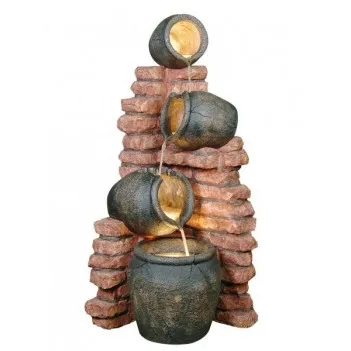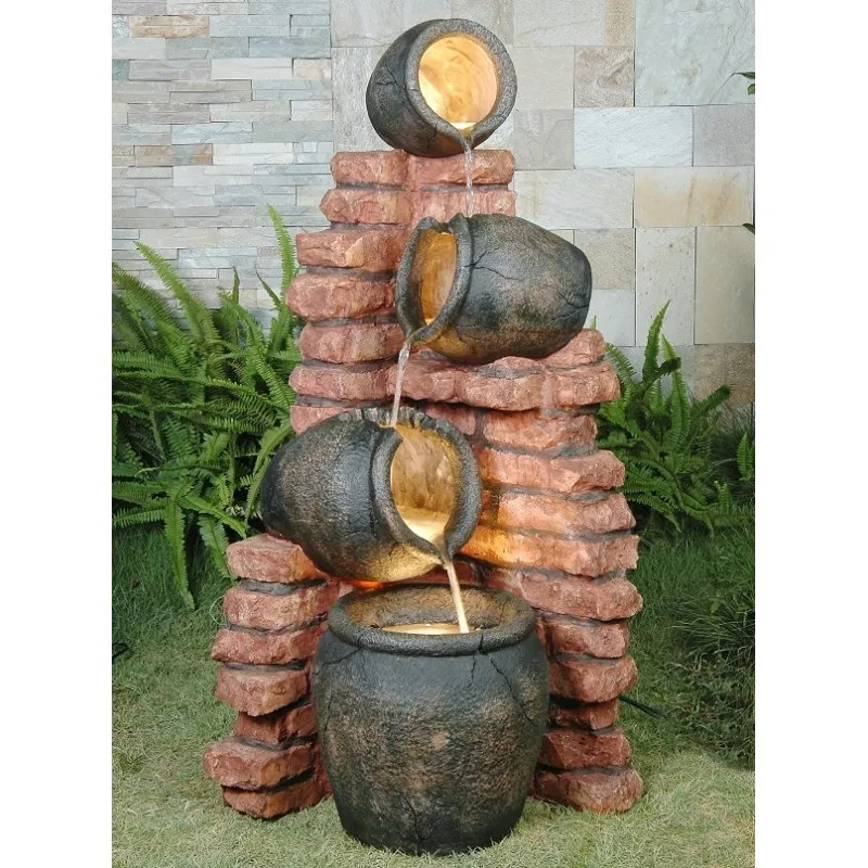 LED-beleuchtetes Wasser strömt aus dem oberen Topf und fließt in die drei unteren Töpfe, wodurch eine beruhigende Atmosphäre entsteht. Jeder Topf enthält Licht, wodurch der Brunnen nachts toll aussieht