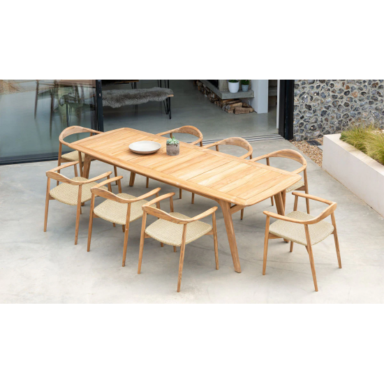 Der Dana Teak Dining Table 2,7 × 1,0 m bietet viel Platz für gesellige Mahlzeiten im Freien. Gefertigt aus hochwertigem Teakholz, überzeugt er durch natürliche Witterungsbeständigkeit und Langlebigkeit. Die große rechteckige Tischplatte eignet sich ideal für Familienfeste und Treffen mit Freunden. Das Design orientiert sich am skandinavischen Mid-Century-Stil und passt perfekt zu modernen Outdoor-Bereichen. Maße: Länge 2700 mm, Höhe 740 mm, Breite 1000 mm. Eine 10-jährige Garantie unterstreicht die Qualität und Zuverlässigkeit.