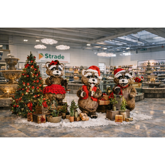 Raccoon Band ist eine animatronische Weihnachtsdekoration aus der Creation Group Kollektion mit einer fröhlichen Waschbär-Band, die Weihnachtslieder singt. Die Bewegungen sind mit dem Sound synchronisiert, inklusive Mund- und Augenbrauenbewegungen. Für den Innenbereich geeignet. Abmessungen: 300 × 150 × 140 cm (L × B × H).