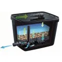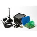 Einkammer-Filtersystem mit unterschiedlichen Filterpartikeln zur Filterung von Teichwasser. Nach mechanischer Filterung durch den Biokern wird das Wasser in den PlusSets durch Filtermix und Filterschwamm biologisch gefiltert, Pumpe und UVC sind inklusive.