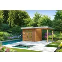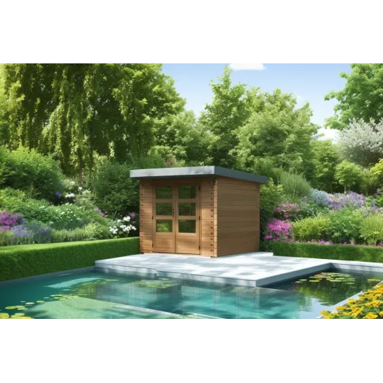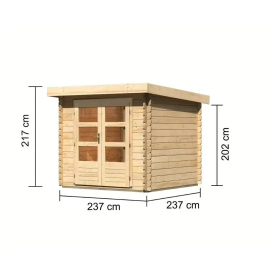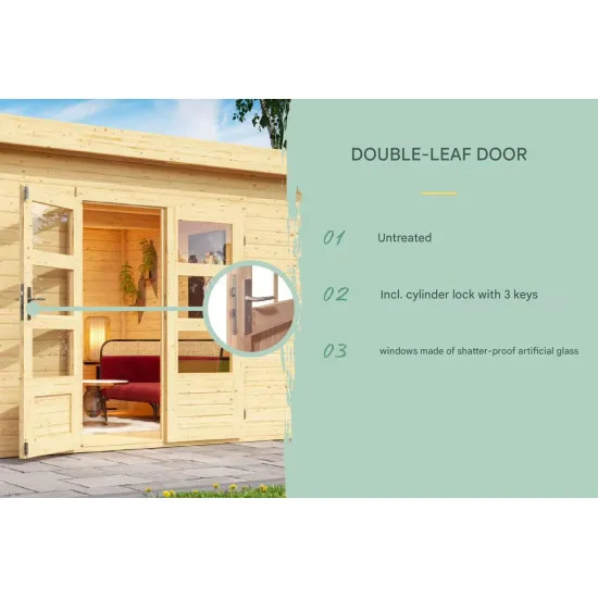 Der Eingang zum Innenraum erfolgt durch breite Doppeltüren mit drei Glasscheiben an jedem Flügel, die den Raum mit natürlichem Licht füllen. Für die Sicherheit sorgt ein eingebautes Zylinderschloss. Das Haus ist in der Naturausführung erhältlich, wodurch Sie es an Ihre individuellen Vorlieben anpassen können. Optional kann es mit einer 2 oder 3 Meter breiten Dachverlängerung ausgestattet werden, was die Funktionalität und Nutzfläche erhöht.