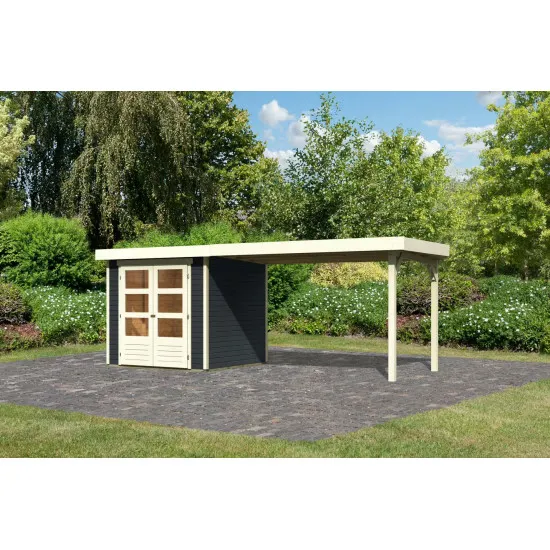 Gartenhaus Askola 2 – ein Akzent in Ihrem Garten. Das 19mm Systemhaus aus nordischer Fichte im einfachen Steck- und Schraubsystem ist in den Farben Braungrau, Anthrazit und Natur erhältlich.