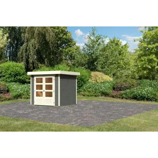 Gartenhaus Askola 2 – ein Akzent in Ihrem Garten. Das 19mm Systemhaus aus nordischer Fichte im einfachen Steck- und Schraubsystem ist in den Farben Braungrau, Anthrazit und Natur erhältlich.