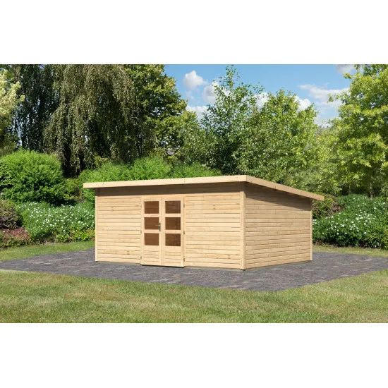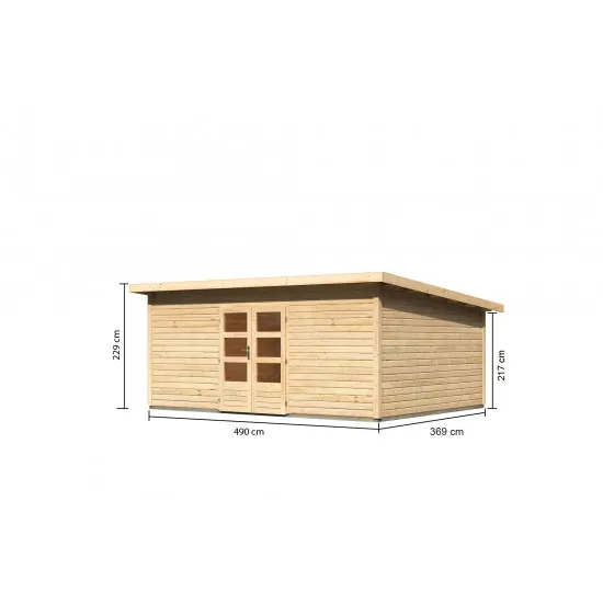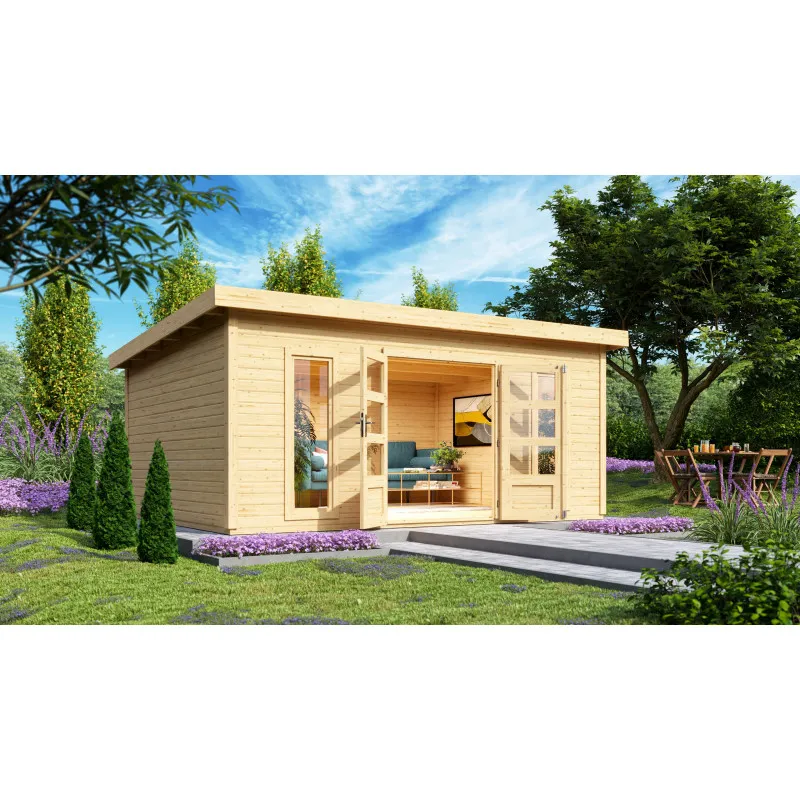 Ein stabiles Haus mit Satteldach mit vielen Möglichkeiten. Das Gartenhaus Northeim 6 besteht aus 38 mm Massivholzbohlen mit doppelter Nut und Feder. Das Haus aus skandinavischer Fichte ist in natürlicher oder moderner terragrauer Farbe erhältlich. Durch die Stärke der Bretter wird das Gartenhaus stabiler und eignet sich daher ideal als zweites Häuschen im eigenen Garten. Mit einem bequemen Sofa oder einer bequemen Sitzecke wird das Gartenhaus so richtig zu Hause. Aufgrund der vielen verschiedenen Größen, in denen Northeim erhältlich ist, passt es in fast jeden Garten. Dank der zweiflügeligen Tür mit drei Lichtausschnitten für das Türblatt und das Riegelschloss dringt Tageslicht ins Innere und ist eine natürliche Lichtquelle. Für noch mehr Helligkeit im Innenraum (B x T) 482 x 363 cm können beispielsweise zwei optionale verlängerte Dreh-Kipp-Fenster links und rechts neben der Tür eingebaut werden. Dadurch öffnet sich die Hausfront optisch und gibt einen weiten Blick in Ihren Garten frei. Der helle Raum kann als Aufbewahrungsort für Gartengeräte genutzt oder mit einer gemütlichen Sitzecke ausgestattet werden, um einen ruhigen Platz im Garten zu schaffen. Gartenhaus Northeim 6 - ein Stallhaus mit Satteldach mit vielen Möglichkeiten für Ihren Garten.