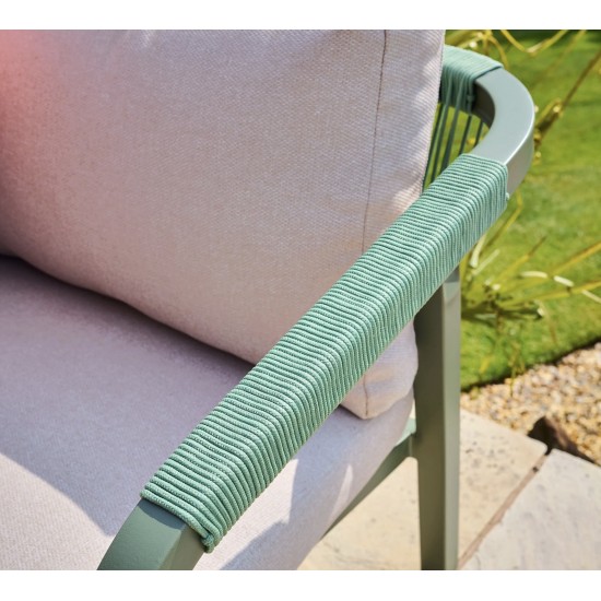Das Genoa Corner Lounge Set umfasst 1 Ecksofa (für bis zu 5 Personen) und 1 Couchtisch. Die Module des Sofas messen jeweils 1450 mm Breite × 750 mm Tiefe × 700 mm Höhe, der Couchtisch 600 mm Breite × 1060 mm Tiefe × 420 mm Höhe. Der Rahmen besteht aus olivgrün pulverbeschichtetem Aluminium, und die 230gsm Polyesterkissen bieten Komfort und Wetterbeständigkeit. Garantie: 3 Jahre.