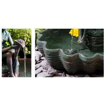 Hergestellt aus hochwertigem Bio-Harz , wodurch es langlebig, langlebig und leicht sowie frost- und UV-beständig ist. Integrierte Niedervolt-LED-Leuchten beleuchten den Springbrunnen nachts und schaffen ein atemberaubendes Schauspiel.