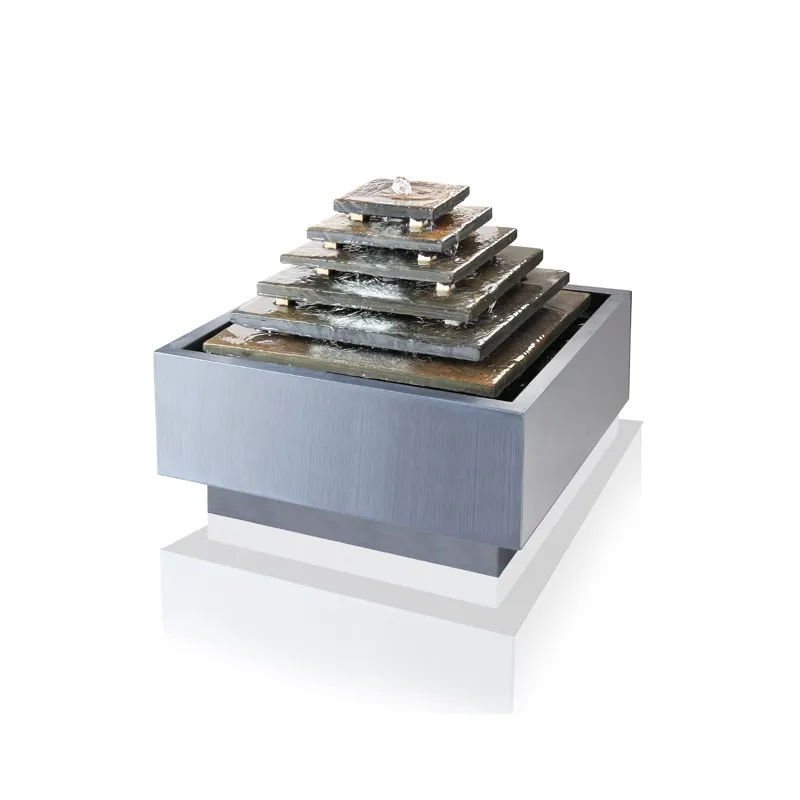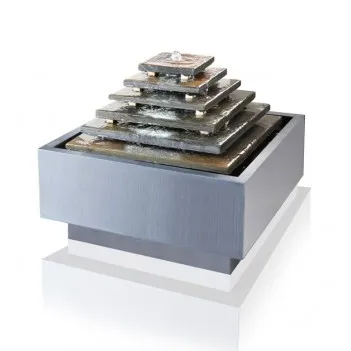 Die Pyramidenstruktur, die die der Aztekenzeit widerspiegelt, besteht aus wunderschönem Naturschiefer und lässt das Wasser Schicht für Schicht fließen, wodurch ein sanfter Strom entsteht. Schaffen Sie mit der Aztekenpyramide Kunst und Majestät im Garten. Durch das individuelle Aussehen der Schieferplatten, die sich im Muster unterscheiden, wird jeder Brunnen einzigartig.