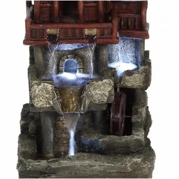 Ein orientalischer Wasserbrunnen ist voller Bewegung und Klang, er ist eine großartige Ergänzung für jedes Haus oder jeden Garten, unabhängig davon, ob er ein ähnliches Thema hat oder nicht. Im Obergeschoss befindet sich ein markantes Haus im Pagodenstil, bei dem Wasser vom Balkon in die Bäche darunter fließt, von denen einer direkt in das Becken an der Basis fällt, während der andere auf einem Gemälde dargestellt ist, das an einem Wasserrad arbeitet. All diese Action wird von LED-Lichtern beleuchtet, was es sowohl tagsüber als auch abends zu einer erstaunlichen Attraktion macht, wenn sich die Lichter mit dem Rauschen des Wassers verbinden, um eine wunderbare Szene zu schaffen. Da es sich um eine eigenständige Funktion handelt, ist keine externe Wasserversorgung erforderlich, und ein 10-Meter-Netzkabel ist im Lieferumfang des Niederspannungstransformators enthalten, um die größtmögliche Auswahl an Standorten zu bieten.