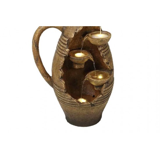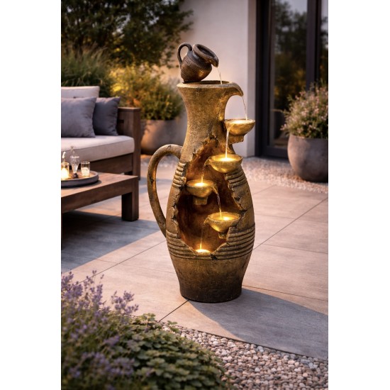 Das hochwertige Resin sorgt für Widerstandsfähigkeit gegenüber Witterungseinflüssen. Die integrierte LED-Beleuchtung hebt den Wasserfluss hervor und schafft eine angenehme Atmosphäre am Abend. Dank Netzbetrieb ist eine zuverlässige Nutzung gewährleistet.