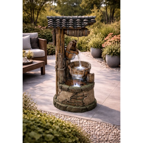 Der Rustic Wishing Well kombiniert traditionelles Brunnen-Design mit moderner Technik. Das langlebige Resin-Material sorgt für hohe Widerstandsfähigkeit gegenüber Witterungseinflüssen wie Regen, UV-Strahlung und Temperaturschwankungen. Die integrierte LED-Beleuchtung hebt den Wasserfluss hervor und schafft besonders am Abend eine entspannende und stimmungsvolle Atmosphäre.