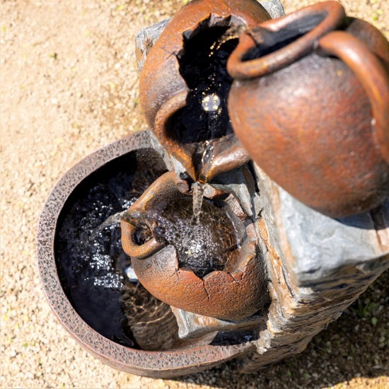 Evora verbindet rustikale Krüge mit moderner Technik. Polyresin garantiert Widerstandsfähigkeit gegen Witterungseinflüsse. Der sanfte Wasserfluss schafft eine entspannende Atmosphäre. LED Beleuchtung hebt den Effekt am Abend hervor. Vollständig selbstständig, kein zusätzlicher Tank erforderlich. 8m Kabel ermöglicht flexible Platzierung.