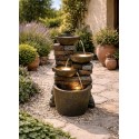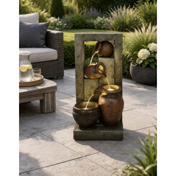Vilamoura Pouring Pots ist ein eleganter Gartenbrunnen mit kaskadierendem Wasserfluss, der eine entspannende Atmosphäre im Außenbereich schafft. Hergestellt aus wetterbeständigem Kunstharz garantiert er eine lange Lebensdauer. Die integrierte LED-Beleuchtung sorgt besonders abends für einen beeindruckenden Effekt. Die Maße betragen L 39 x W 32 x H 81 cm, das Gewicht 13 kg, was Stabilität und einfache Installation ermöglicht. Für den Außenbereich geeignet und netzbetrieben.