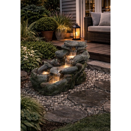 Das Wasserfeature Curran Woodland River bringt die Ruhe eines natürlichen Bachlaufs in Ihren Außenbereich. Das Wasser fließt kaskadenartig durch eine naturgetreu gestaltete Struktur und erzeugt einen angenehmen Klang. Die LED-Beleuchtung hebt die Bewegung des Wassers hervor und sorgt für eine stimmungsvolle Beleuchtung bei Dunkelheit. Das System ist komplett eigenständig und wird über Netzstrom betrieben. Gefertigt aus hochwertigem, wetterbeständigem Kunstharz bietet es eine lange Lebensdauer. Perfekt für private und gewerbliche Außenbereiche.