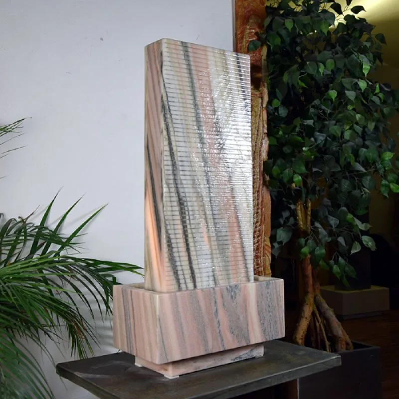 Handgefertigte Wasserwand aus österreichischem Sölker Marmor. Besonders hervorzuheben ist die dezente Innenbeleuchtung, die die Wasserwand atemberaubend in Szene setzt.