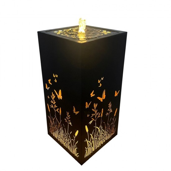 Das Wild Meadow Wasserspiel (Höhe 64 cm × Breite 30,5 cm × Tiefe 30,5 cm) besteht aus wetterbeständigem Zink in elegantem Schwarz. Filigrane Blumen-Silhouetten im Cut-Out-Stil verleihen dem Brunnen eine ländliche, dekorative Note. Das selbstständige System mit integriertem Reservoir und 250 LPH Pumpe wird über Netzstrom betrieben und benötigt keine zusätzliche Installation. Warmweiße LED-Beleuchtung sorgt für stimmungsvolle Akzente am Abend.