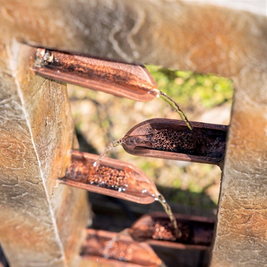 Das robuste Polyresin ist witterungsbeständig und langlebig. Die Bronzeoptik wirkt klassisch und harmoniert mit verschiedenen Gartenstilen. Fünf Ebenen sorgen für ein beruhigendes Wasserspiel. Keine zusätzliche Wasserinstallation notwendig.