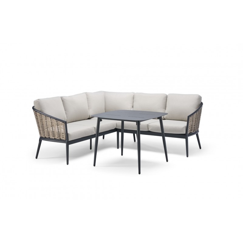 Das Pavilion Square Casual Dining Set ist ein stilvolles Outdoor-Möbelset für entspanntes Essen und Lounge-Momente im Freien. What’s included: 1 Pavilion Casual Ecksofa (1960 × 760 × 730 mm) und 1 Pavilion Square Dining Table (850 × 670 × 850 mm) aus pulverbeschichtetem Aluminium und handgewebtem Rattan, mit hellgrauen Polyesterkissen. Garantie: 3 Jahre Rahmen/Weave, 2 Jahre Kissen.