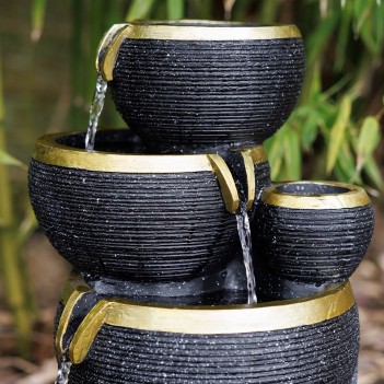 Kompakter dreistufiger Brunnen mit schwarzem Design und goldenen Akzenten für Garten oder Terrasse.